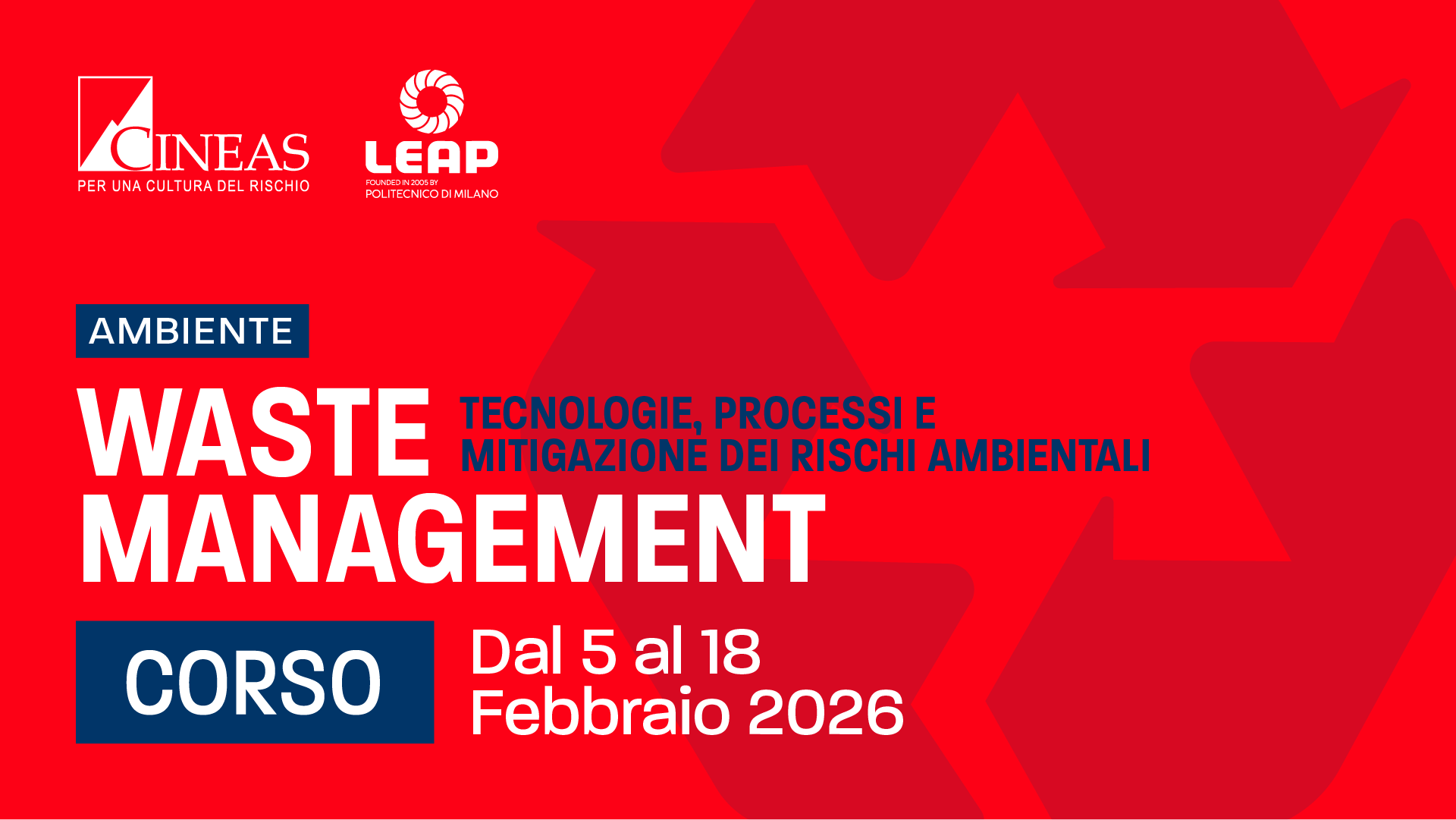 CINEAS (Consorzio Universitario per l’Ingegneria nelle Assicurazioni) e LEAP (Laboratorio Energia e Ambiente Piacenza) organizzano il corso di formazione “Waste Management: Tecnologie, Processi E Mitigazione Dei Rischi Ambientali” dal 5 al 18 febbraio 2026.